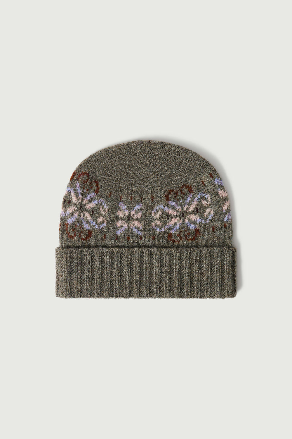 BERYL es un gorro confeccionado en un motivo jacquard de inspiración inglesa, se distingue por su diseño gráfico elegante. Perfecto para enfrentar los días frescos con una nota de chic.