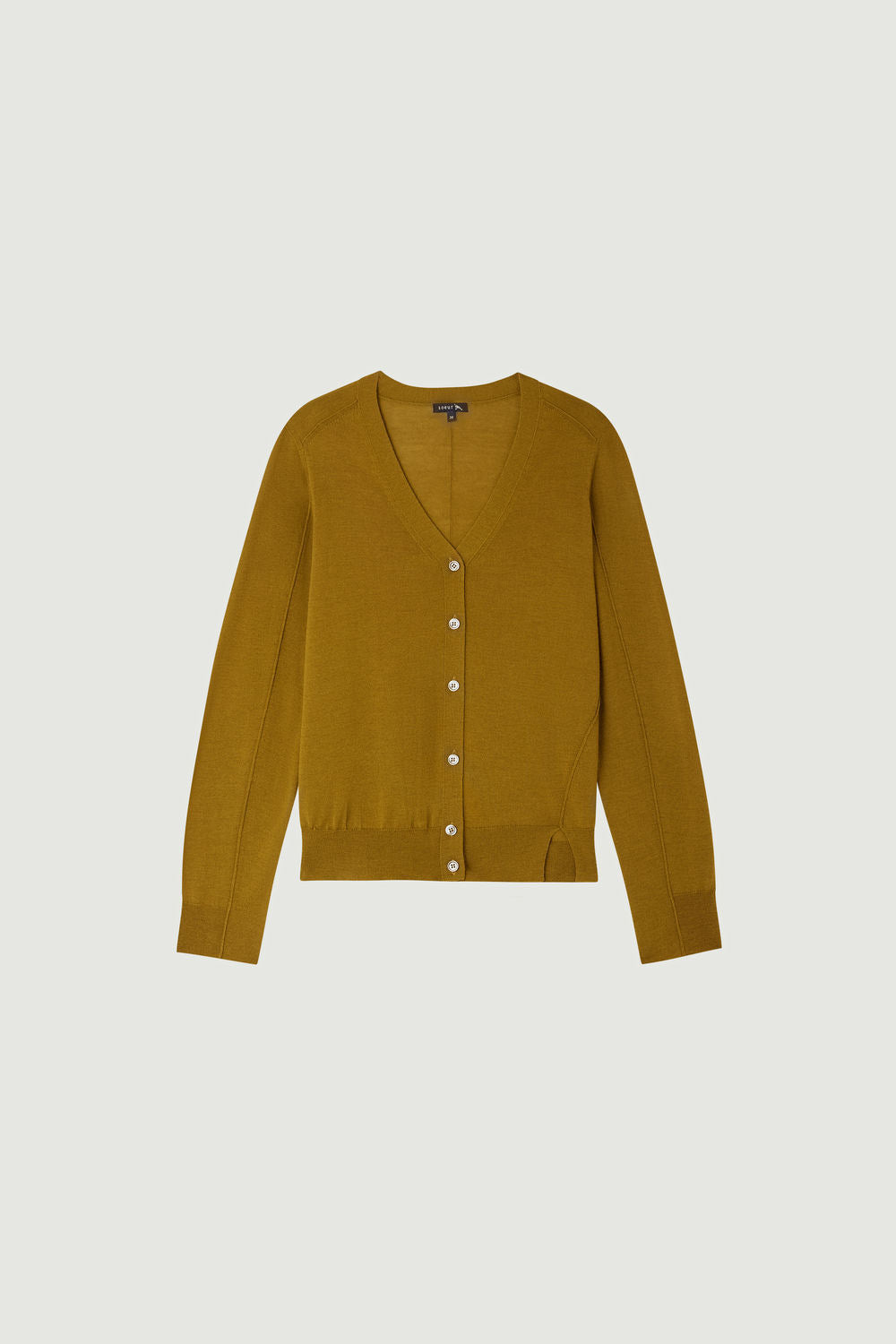ALYSSA es un cárdigan holgado con un amplio escote en V. Está tejido en una lana merina extrafina para llevar directamente sobre la piel. La asimetría en la parte inferior del cuerpo, las disminuciones, los acabados de canalé y las costuras invertidas son detalles que enriquecen este cárdigan falsamente clásico.