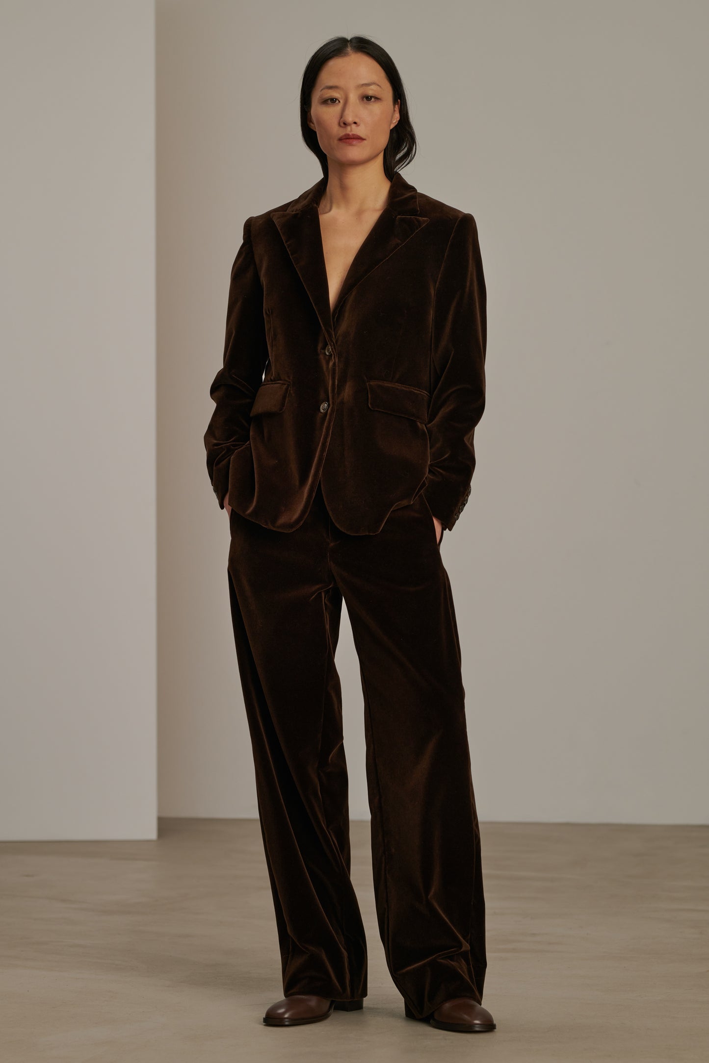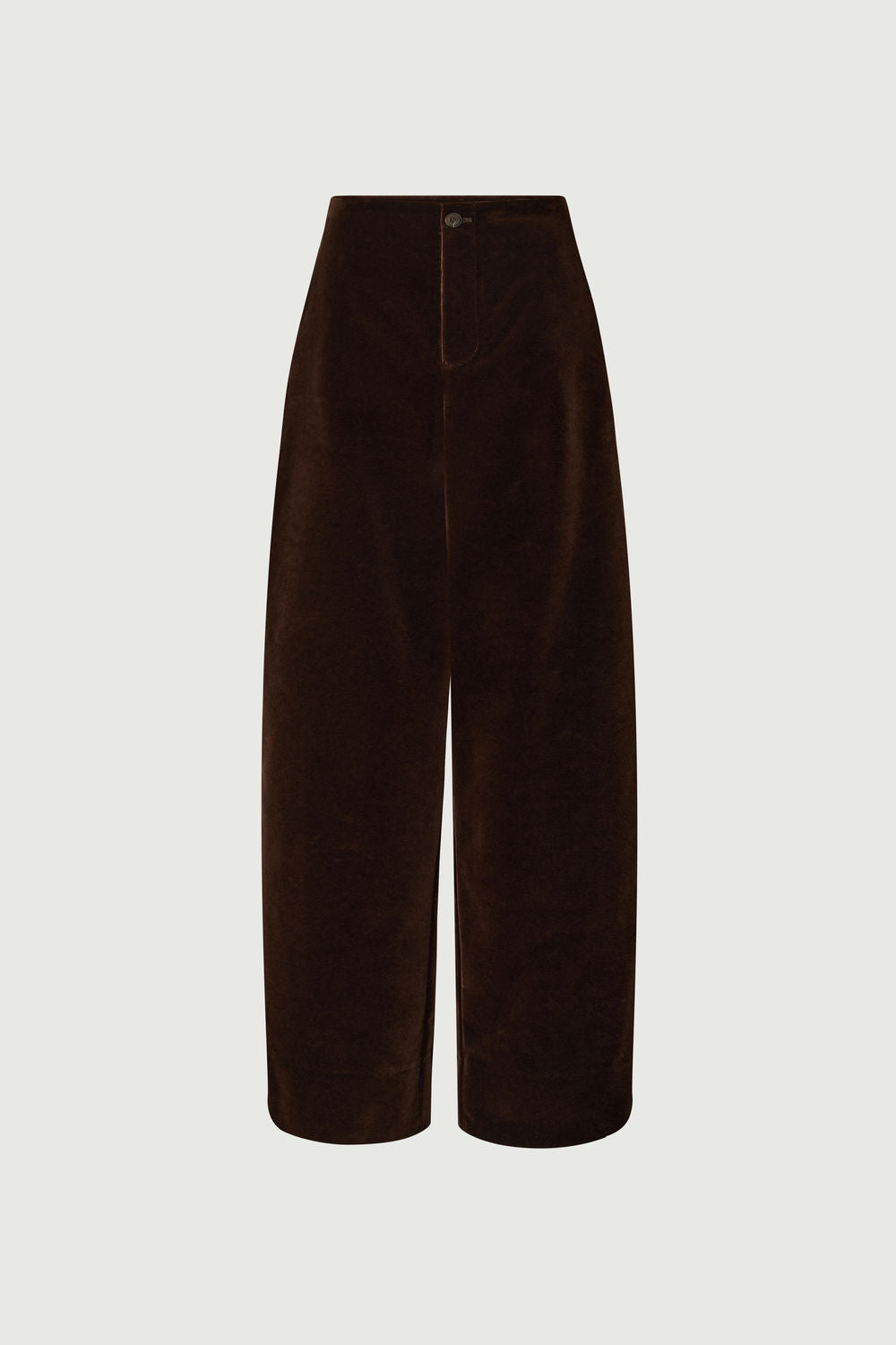 CELESTIN es un pantalón de talle alto ligeramente acampanado. Su corte minimalista, sin cinturón ni pinzas, se adapta a todas las siluetas. El terciopelo liso resalta su color marrón chocolate brillante.