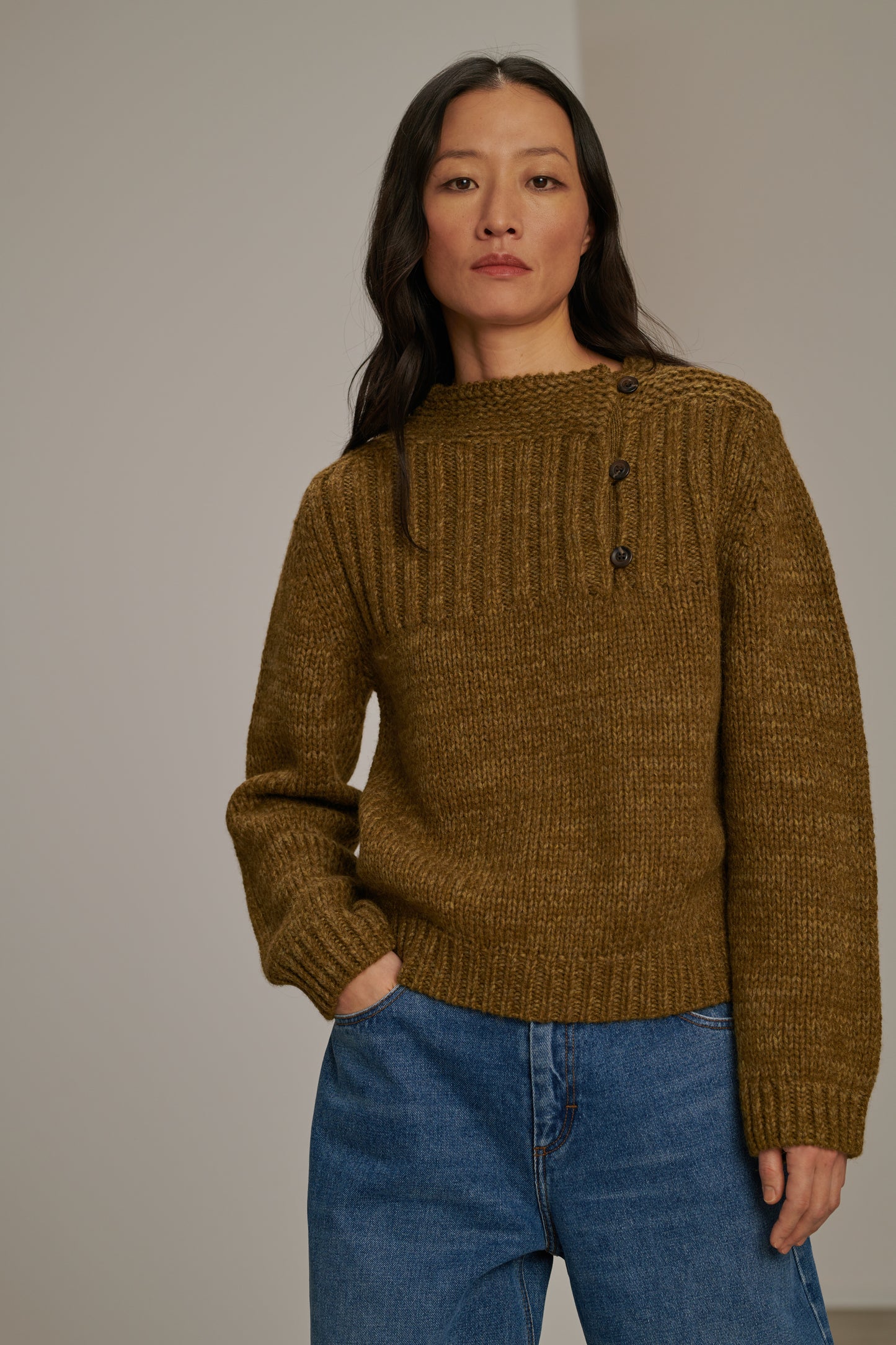 BISCAROSSE es un jersey de manga larga, tejido con un hilo jaspeado de lana virgen. Tejido en un punto grueso pero aireado, es flexible y cómodo. Una apertura abotonada en la parte delantera permite dejar entrever un escote en el costado. Con un efecto visual de rayas, el color se revela jaspeado en matices de caqui y bronce.