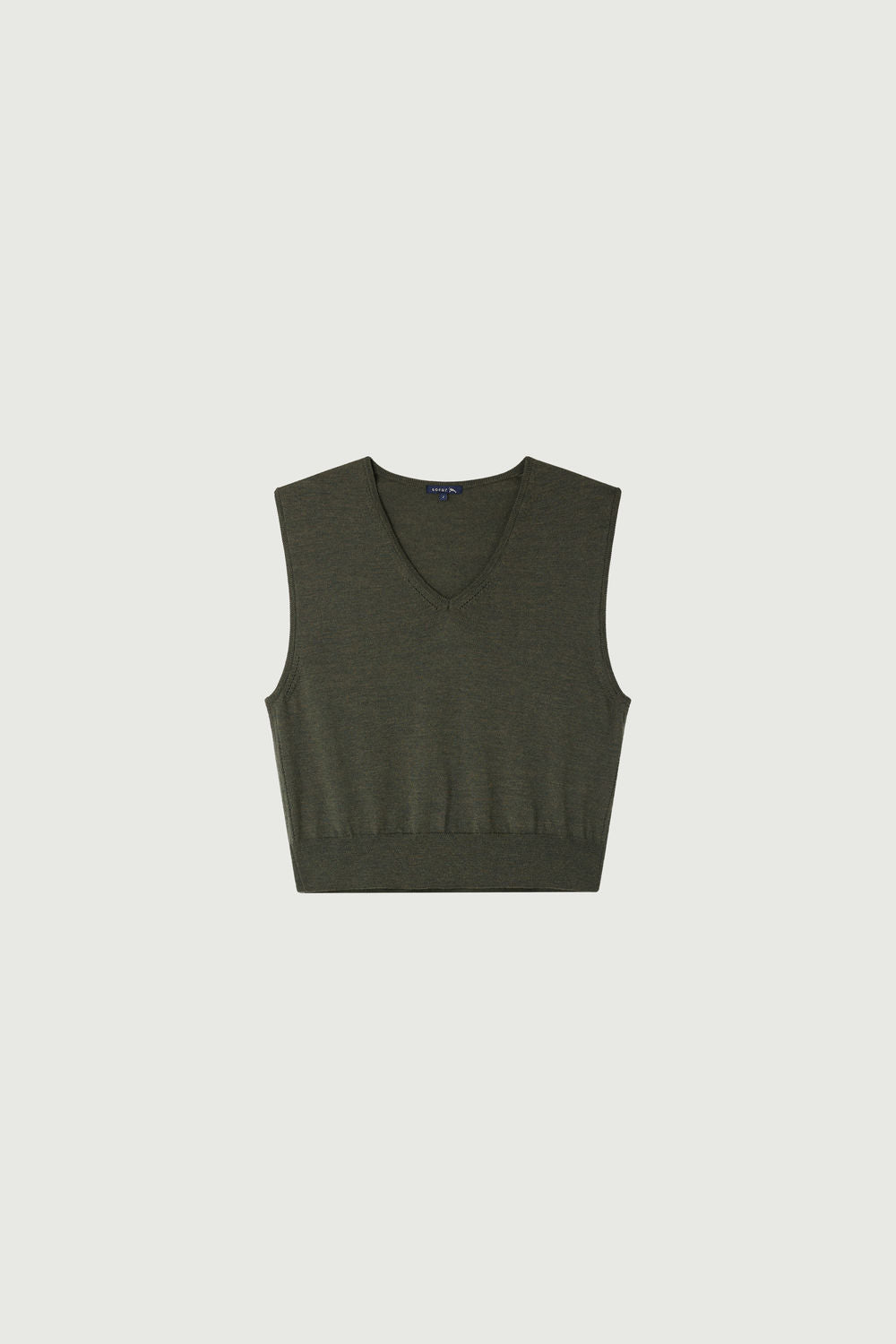 SONIA es un jersey sin mangas tejido en lana merina, un básico infalible de nuestro guardarropa. Simple en apariencia, se puede superponer en todas las siluetas o llevar directamente sobre la piel. La lana merina fina y flexible destaca por la intensidad de su color caqui profundo.