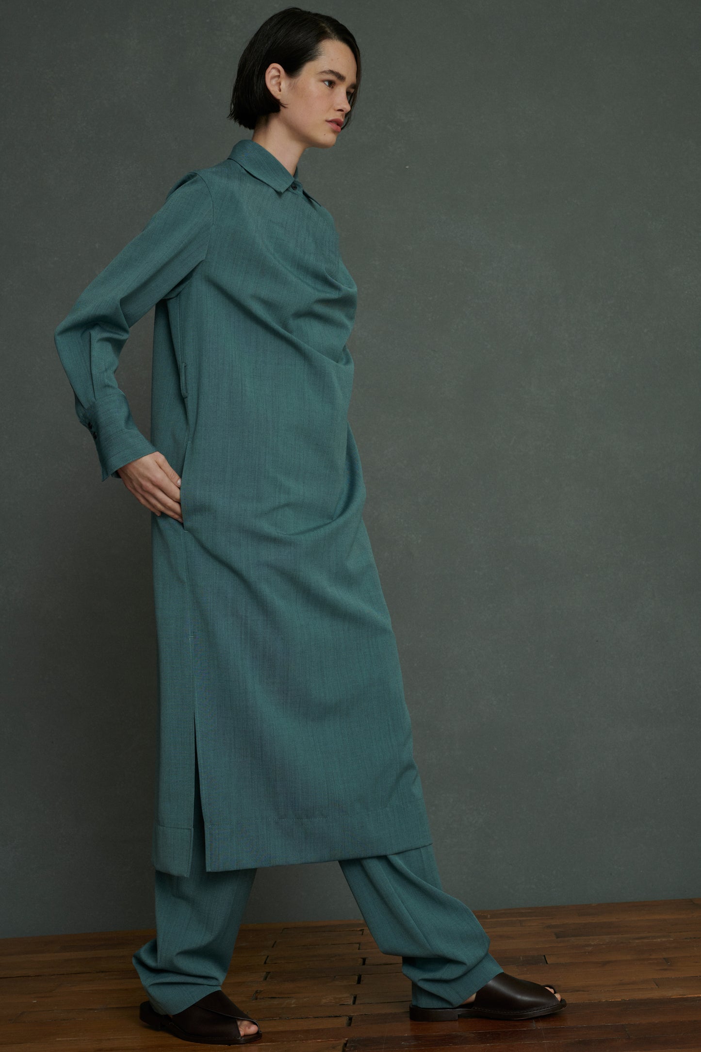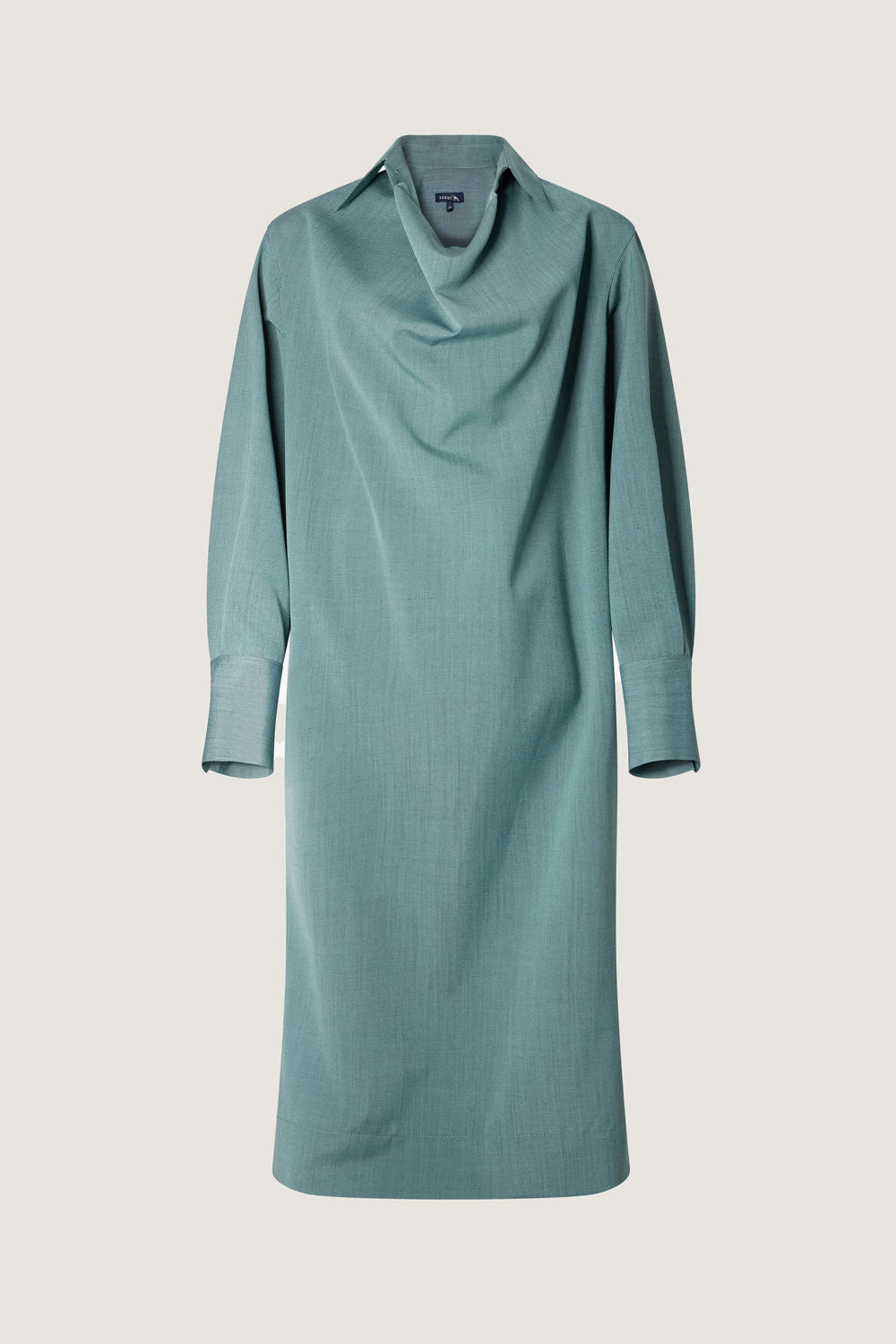 ARPEGE es un vestido de color verde agua que puedes llevar suelto y recto o con cinturón para acentuar la cintura. El diseño del cuello es una firma del Studio. En este caso, el exceso de tela en la parte delantera crea un drapeado adaptable. Confeccionado en lana flexible, la tela mezcla hilos de diferentes colores que crean un efecto cambiante, casi iridiscente.