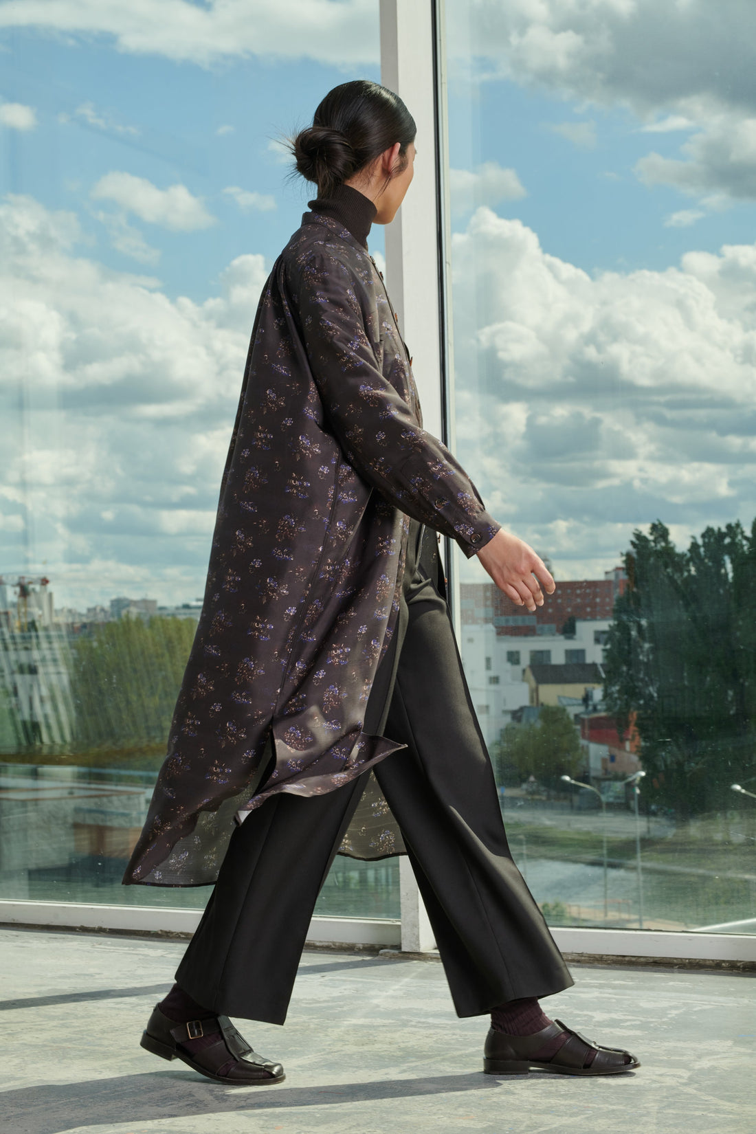 Vestido de seda de Dupioni estampada - Vestido largo y volumen recto, se puede llevar con o sin cinturón- Manga larga con puño abotonado- Escote redondo y cierre de botones en la parte delantera- Parte inferior de la prenda en forma de camisa- Cinturón desmontable